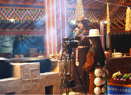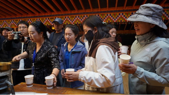 9号大帐内抑扬顿挫的曲调吸引众多游客前往大帐观看欣赏,大家拿出手机纷纷拍照留念,帐内工作人员热情地为大家倒上热腾腾的酥油奶茶,为远道而来的客人洗尘解乏。